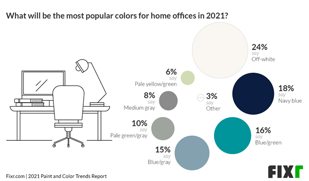 Veel mensen zijn vorig jaar voor het eerst vanuit huis gaan werken, wat heeft geleid tot een aantal nieuwe kantoren aan huis. Op de vraag wat kleurspecialisten dachten dat deze kantoren zouden worden geverfd, waren de antwoorden gemengd. 25% dacht dat gebroken wit de voorkeurskleur zou zijn, terwijl 18% dacht dat marineblauw het vaakst zou worden gebruikt. Aan de andere kant dacht 16% dat blauw/groen aantrekkelijk zou zijn, terwijl 15% dacht dat het blauw/grijs zou zijn. Deze verschillen zouden kunnen worden verklaard door het feit dat kantoren aan huis soms als logeerkamer of woonkamer moeten worden gebruikt wanneer zij niet als werkruimte in gebruik zijn.