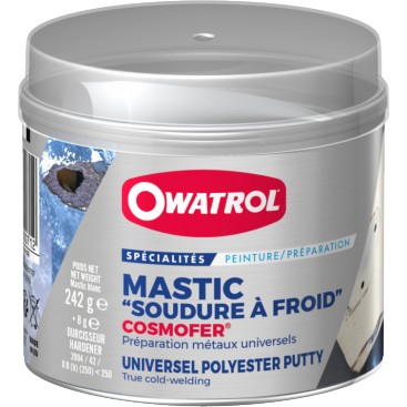 Mastic Cosmofer van Owatrol is een echt koudsoldeersel. Ideaal voor isoleren, stoppen, opvullen, afdichten, voegen, verankeren, lijmen, vastzetten en egaliseren van oneffenheden op tal van ondergronden.
